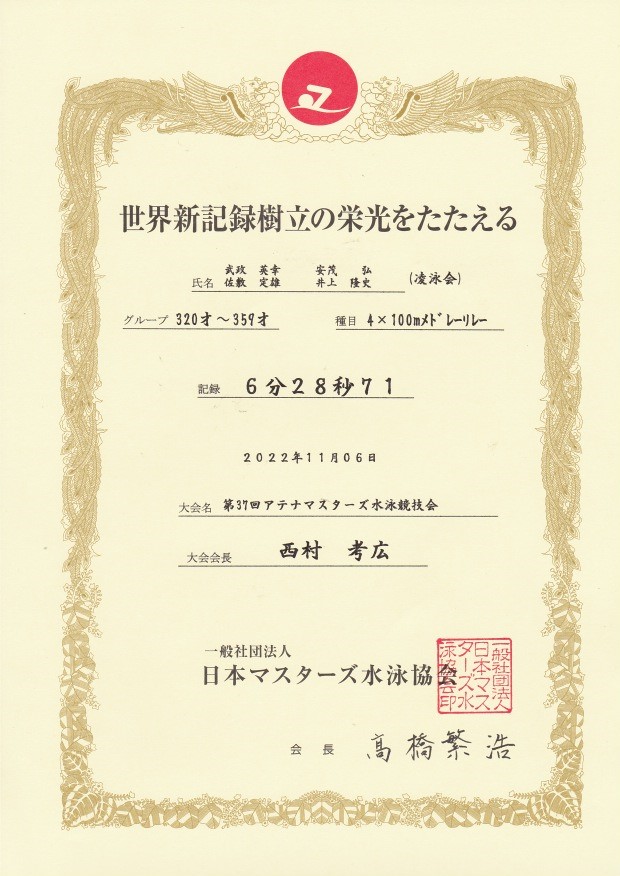 第37回アテナマスターズ大会2022-11-6に於て、凌泳会のメンバー 武政英幸(S39)、安茂弘(S39)、佐敷定雄(S49)、井上隆史(S37)のメンバーで、320才~359才区分の4×100メドレーリレーの世界新記録を出しました。
